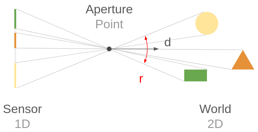 In a 2 dimensional flatland, a camera can be defined by a sensor, an aperture point, and a viewing direction. The camera "looks" in a direction (d), which is perpendicular to the sensor. Rays of light can be rotated along one direction (r) from the camera center, and the direction of this deviation is directly mapped to the main direction of the sensor (moving "down" in the sensor, moves "up" in the ray deviation r).