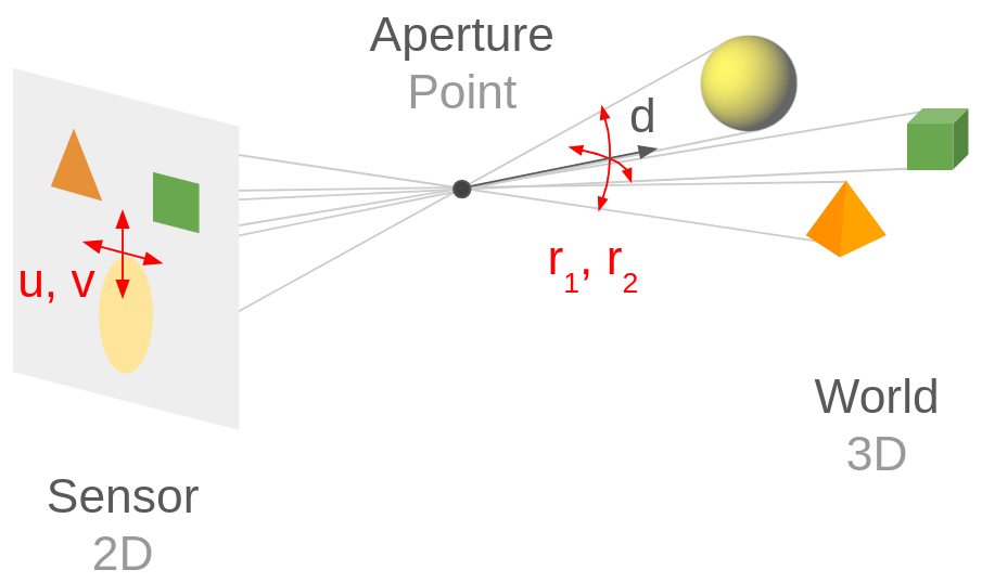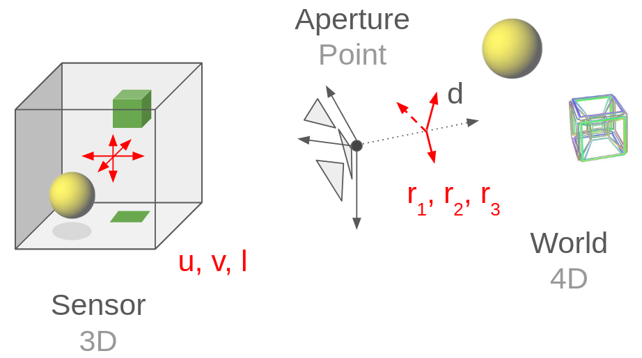 By extending this logic to 4D, we get: Again, a pinhole aperture, which is just a point through which all rays must pass, a 3D sensor, and a main viewing direction (d) perpendicular to the sensor. Now, there are three planes (r1, r2, and r3) that rays can be rotated when entering the lens, which correspond to the three main directions of the sensor (u, v, and l). Luckily for us, our brains have pretty good intuitive understanding of 3D space, and so the 3D sensor is quite easy to imagine, as you can think of it like a "painted volume", where the color of each voxel in the volume corresponds to the intensity of light coming from that direction. The viewing direction, on the other hand, is trickier, since it is perpendicular to the entire sensor volume. For now, you can try to imagine the light entering the sensor through a "different direction", like a wormhole.