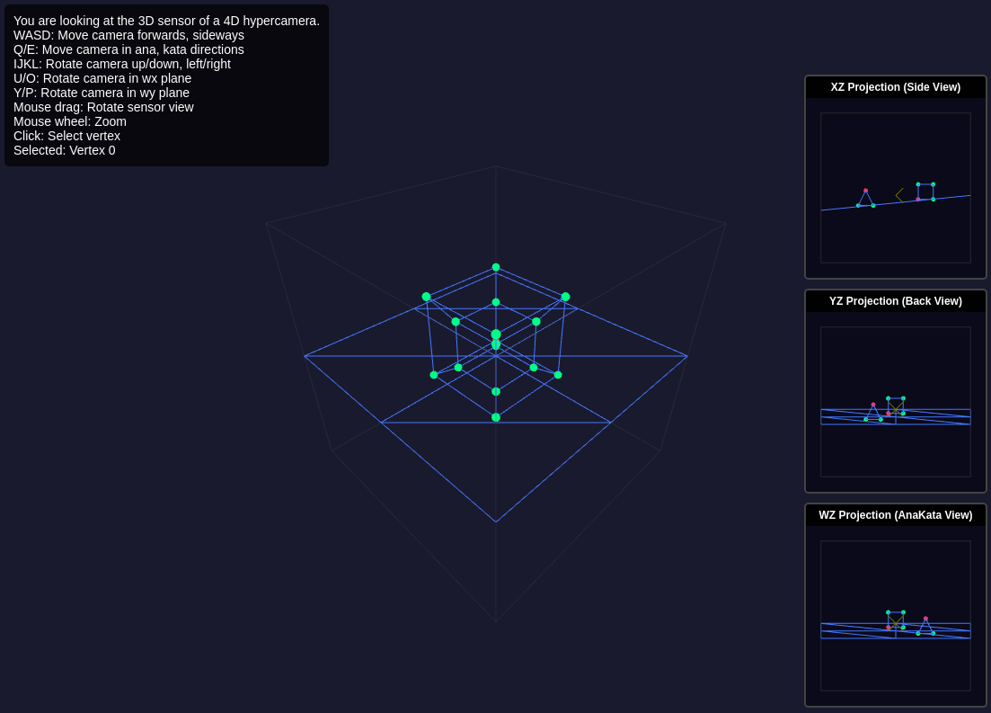 In this visualizer, you control a 4D camera that is moving around a hyperworld, with gravity in the z direction, a "hyperfloor" (a 3D surface which covers x, y, and w directions, but is infinitely thin in z direction), and some hyperobjects which can be pushed around.